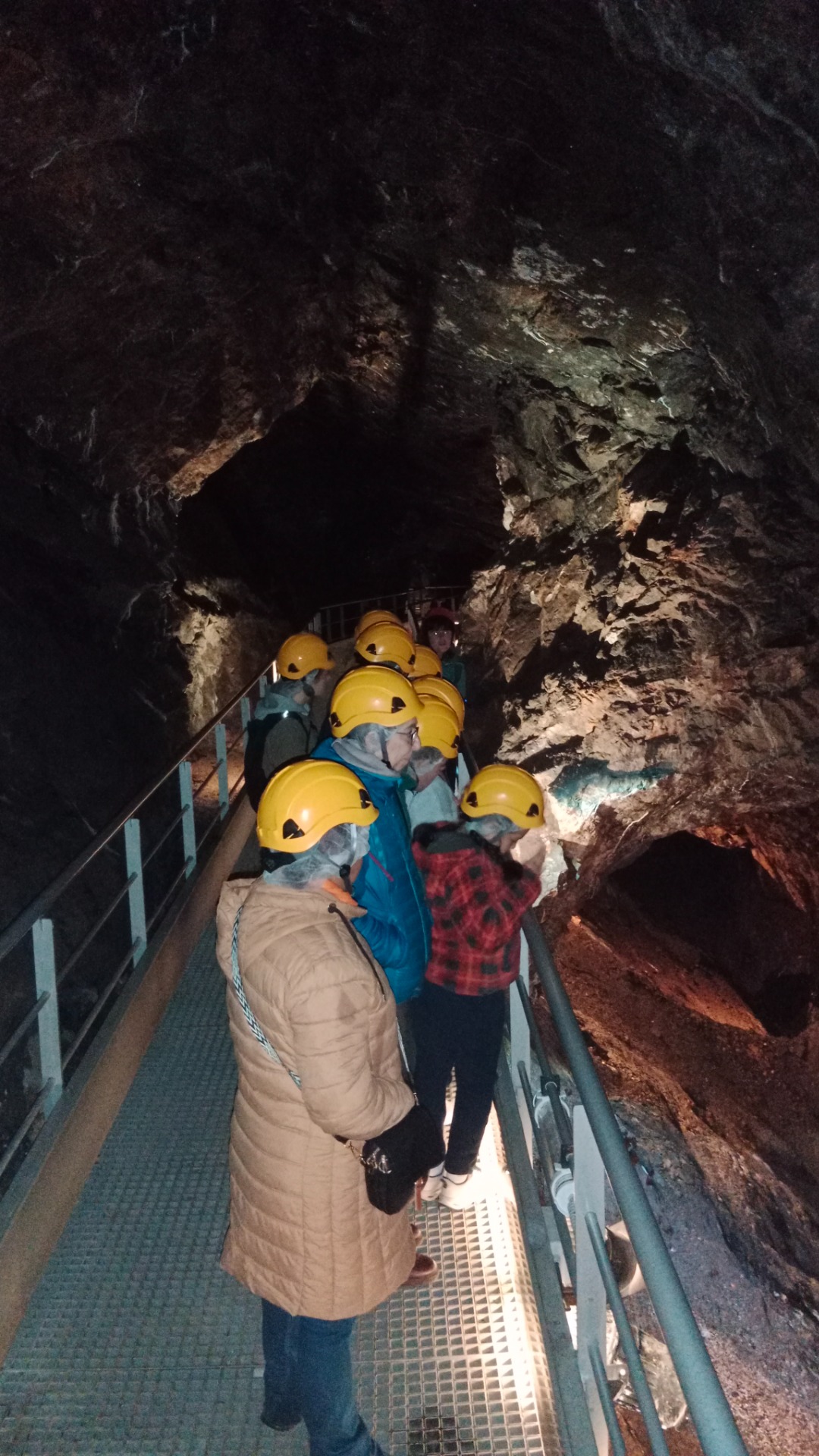 Tras las primeras explicaciones al comienzo de un largo pasillo debidamente iluminado para la ocasión, nos hemos puesto los cascos (mejor no pensar por qué serán necesarios) y hemos avanzado. Hemos comenzado la visita en el llamado 2º piso y, en el recorrido, hemos podido echar un vistazo al profundo 3º piso que posteriormente visitaríamos, desde las alturas y preciosas galerías compartidas por ambos pisos.