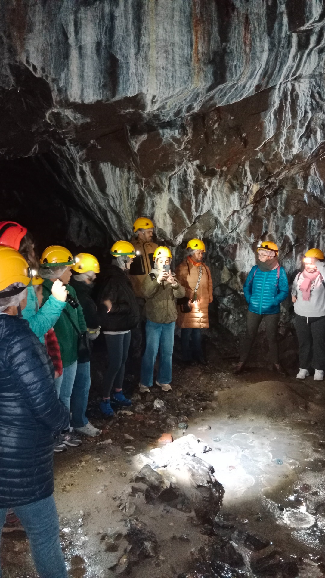 Primeramente han proyectado un vídeo para ilustrar parte de la historia de la mina y mostrarnos parte de los pasadizos y cabidades que no ibamos a poder visitar. Hemos querido pensar que con eso y los ánimos que entre todos, guía incluída, hemos transmitido a Gladys, ésta decidiría finalmente adentrarse con nosotros en la caverna minera, pero no lo hemos logrado. Ana, recién llegada de su tierra y aún en periodo de aclimatación (cómo no, no sé si eso termina nunca), ha ejercido de buena hija y se ha ofrecido a acompañarle en el tiempo de espera exterior, pero Gladys a su vez ha ejercido de buena madre y se ha negado en redondo. Nos vemos en un rato, Gladys.