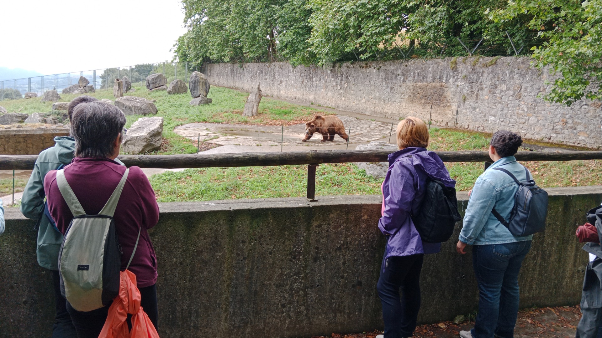 Tras el último bocado, hemos completado, cada cual a su ritmo, el recorrido que da la vuelta completa al parque. Monos enanos, traviesos e inquietos; el lobo solitario; el colorido y elegante jaguar; los enormes buitres que han perdido la capacidad de volar; el tremendo oso pardo paseante; los grupos de herbívoros que campan a sus anchas… y un laaaargo etcétera. Una mirada al reloj nos ha recordado que Emilio estará esperándonos, y, tras una visita fugaz al bosque donde la mitología es la protagonista, hemos llegado a la salida. Allí, para terminar, una última foto de grupo, cómo si no. La lluvia nos ha respetado bastante más de lo que se prevía/temía al comienzo del día. Menos mal.